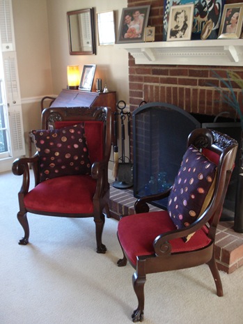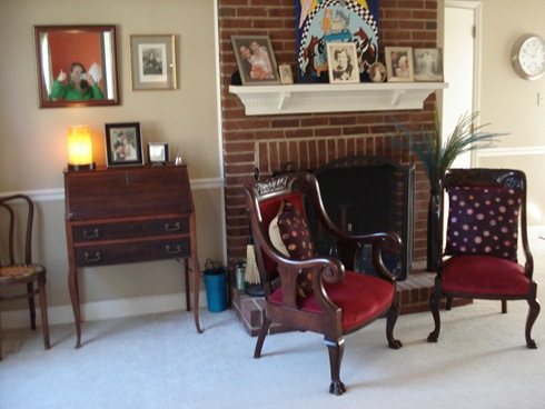 The chair on the left is painted with Williams Shakespeare, the little desk is the husband’s new laptop station and the his and hers (I think King & Queen style?) chairs filled up our empty den perfectly. (I plan to get the chairs reupholstered in the coming weeks with something hip and modern 😉 )