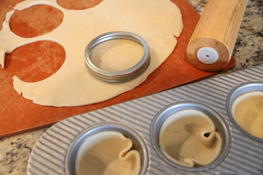 To cut out perfect circles, use a large mason jar lid! Very gently place the crust in the muffin tin. If you press it in hard it might stick, so just set it in there lightly.