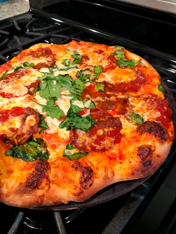 We just rolled out the dough and assembled it on the countertop and then cooked it on the pizza stone. Admittedly, it didn’t transfer over very well! We need to buy a pizza peel.