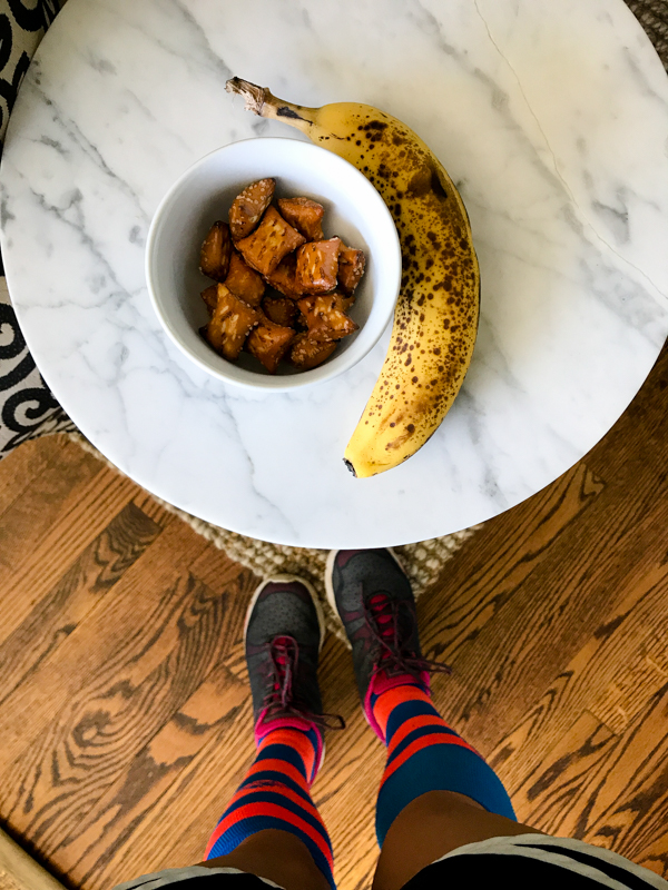 I had an hour break in between games, so I went home just so I could sit down and have a snack. Peanut butter pretzels and a banana! #carbs