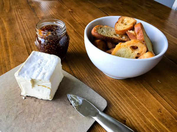 Thomas surprised us with the dinner menu, and put out my favorite appetizer — Saint Angel triple creme brie, fig spread and crostini. Plus olives and chips and red wine for the moms!