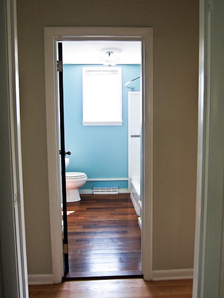 What a fantastically clever idea to paint the interior of your kitchen drawers! And that luscious robin’s egg blue? Gorgeous on the walls, too. Also, I am in love with the tranquil blue against the white of the fixtures, and the dark, rich wood of the floor in the master bath.