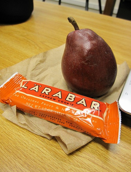 I had originally planned these snacks, but I ditched the LaraBar in favor of the popcorn. I got the pear at EarthFare this afternoon. Lauri and I walked for about an hour in the sunshine. It was a delicious pear!