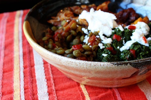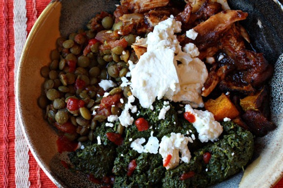 Lunch was a harmony of leftovers – and tasted amazing! Cranberry chicken, lentils, squash and spinach, with sriracha and goat cheese!
