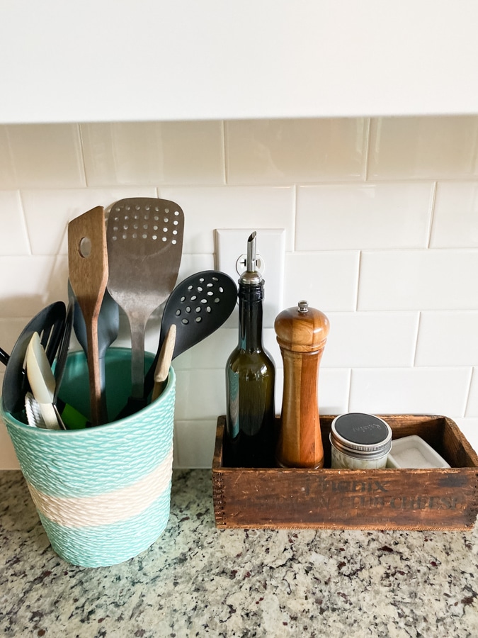 A good vintage wooden cheese box is great for our salt, pepper, and butter. I have a bunch of these my grandmother gave me, and they are perfect for the depth of our pantry shelves. I also LOVE a knife rack (like this pretty wooden one) so you don’t use any counter real estate on a block. (One day I would love a drawer with knife storage built in even more!) And finally, get a pretty sponge holder so you don’t have to see your sponge when you walk in the kitchen. Pretty linens and a nice dish soap dispenser complete your counters with a grown-up feel.