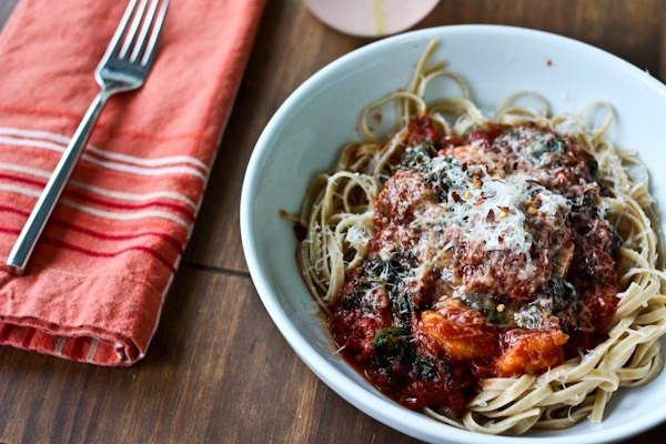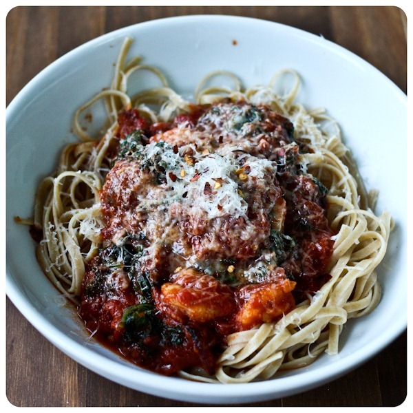 Whole Wheat Linguini with Shrimp + Bacon in a Kale-Tomato Sauce