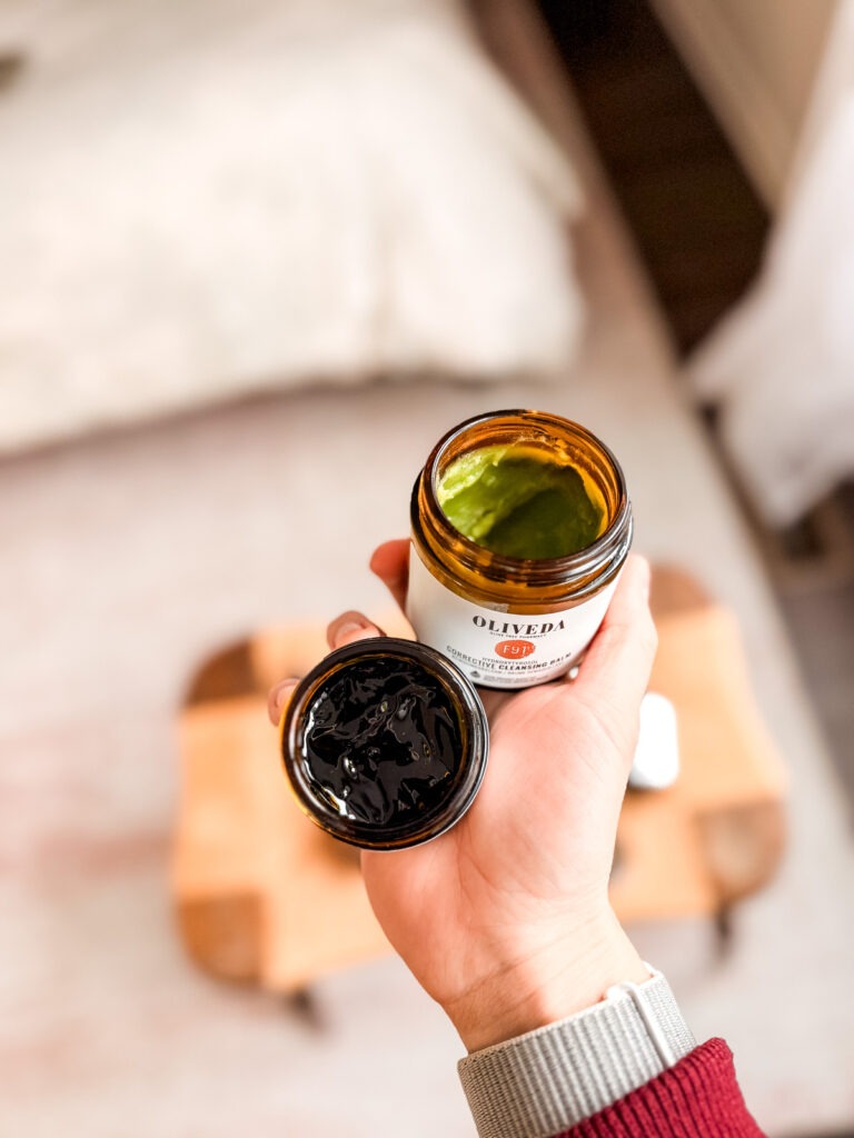 Once or twice a week, I love using a deeply hydrating overnight balm. This is especially helpful if you’ve spent a lot of time outdoors like skiing or hiking. Two favorites: corrective cleansing balm and lotus glow cleansing balm.