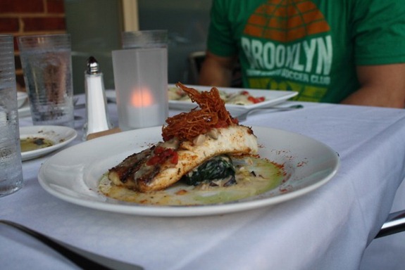 The main event was this INCREDIBLE (!!) fish – something along the lines of red snapper, methinks, with a bunch of flavors over a goat cheese stuffed swiss chard leaf.