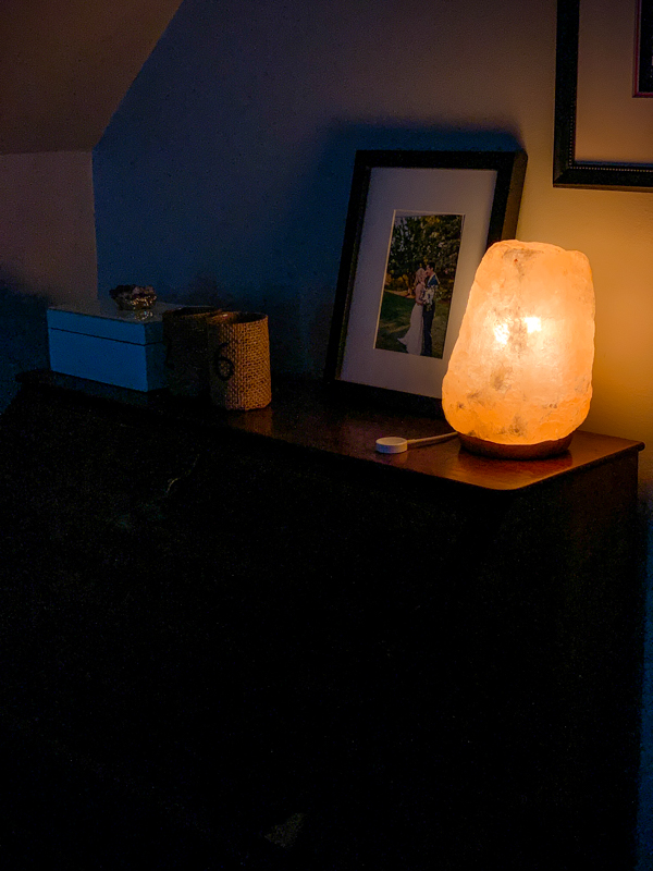 When we go upstairs at night, we say “Alexa goodnight” and she turns off the main floor lamps and turns on the upstairs ones. We have my nightstand lamp along with a new Himalayan salt lamp on two plugs up there. The salt lamp is great for nighttime with Birch when I need light but want to keep things dim. It creates just the perfect amount of light to see for diaper changes and nursing. We just say “Echo (because we have an Echo up there) turn on salt” in the middle of the night and we can see without getting out of bed.
