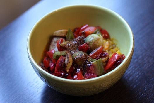 I heated about 1 cup of the root veggie mash "soup" and topped that with heated leftovers plus cinnamon. Totally bliss. Loved the combo of the sweet squash, tart cranberries, savory sausage, spicy cinnamon, hot peppers and big ol’ brussels.