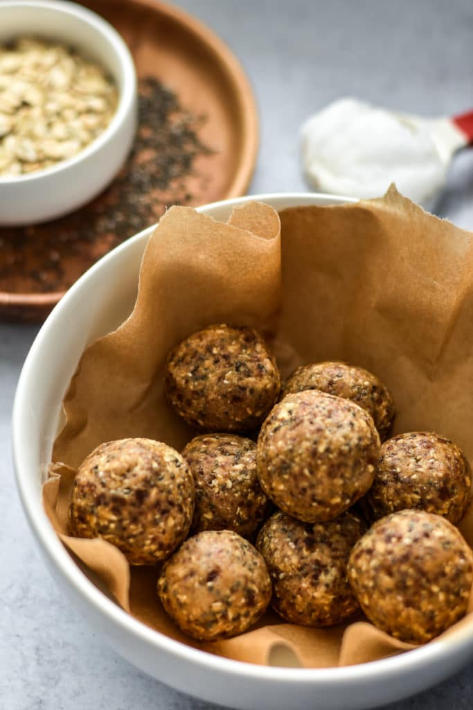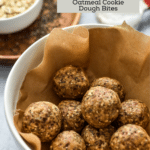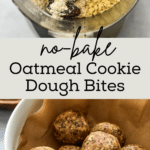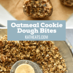 These healthy, no bake cookie dough bites have are sweetened with dates, are made with oat flour, chia seeds and graham crackers, and taste like oatmeal cookie dough! They make a great snack or dessert.