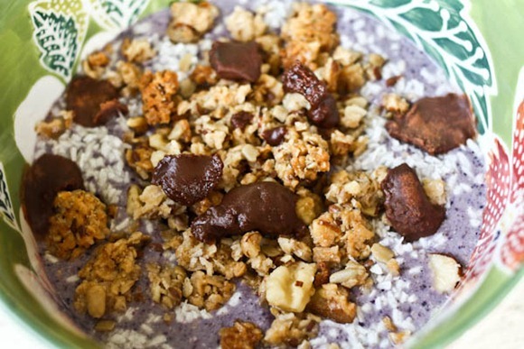 The base was 1 cup of milk with 1/2 cup frozen berries, 1/3 cup oats and 1 tbsp chia seeds. Then I added coconut, Cville Cluster granola (best ever!!) and some Cacao Bliss chocolate coconut butter blobs.