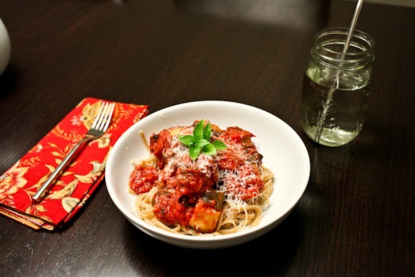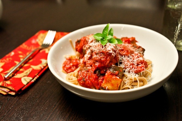 Matt made a quick sauce out of fresh tomatoes, fresh eggplant, a can of tomato paste, a sprinkle of sugar, salt, and oregano. We stirred in leftover tofu for protein and served it over whole wheat linguini with fresh basil and Asiago cheese.