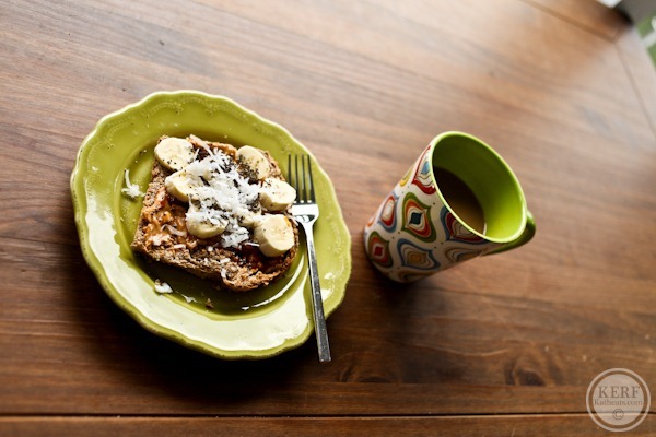 High Five topped with Barney Butter, pumpkin butter, sliced banana, chia seeds and coconut. Plus lots of milk in my coffee for extra protein & calcium.