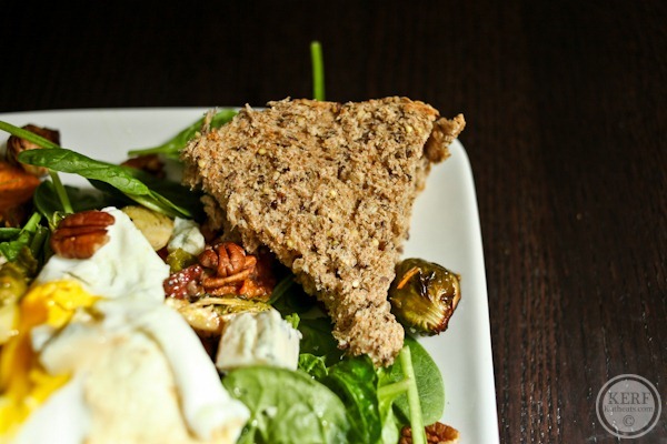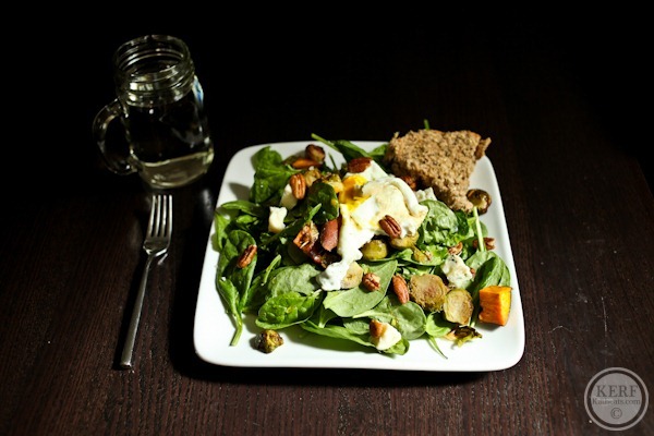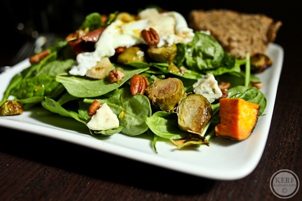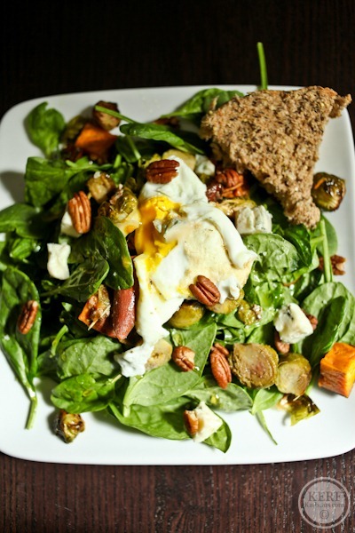 I made us salads piled high with leftover brussels and sweet potatoes, pecans, gorgonzola dolce and sunny side up eggs