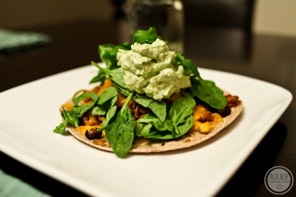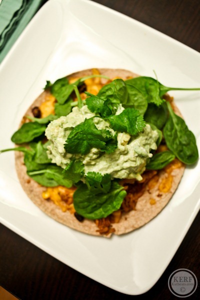 Sweet potato + black bean tostadas/burritos. She grated a sweet potato (brilliant!) and cooked it with beans, corn, corn tortilla pieces (I believe!) and Mexican spices. We piled that on whole wheat tortillas with salsa and lots of shredded cheese and baked it in the oven for about 15 minutes, until the cheese was melted. Meanwhile, I mashed an avocado with 2:1 greek yogurt for a delicious and nutritious cool topping. Cilantro and spinach for garnish!