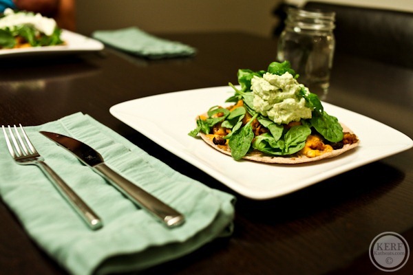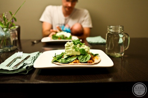 That dinner looks delicious. I love big piles of food. I’ve been using sweet potato as a spread a lot lately. My favorite is mixing it with chipotle and cumin to make salmon tortilla pizzas.