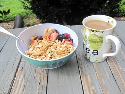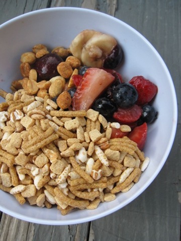 I came down and assembled a nice yogurt bowl with a Food Lion brand raspberry yogurt, Kashi GoLean (which was a pleasant surprise to find in the pantry โ it was for Aunt Pat), leftover fruit salad and a few peanuts.