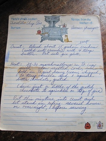 Hereโs the best I can do with the Chocolate Chip Pie recipe. It is my Grandmother Youngerโs recipe and hereโs her original recipe card! Itโs a pretty simple recipe with marshmallows, milk, heavy cream (whipped) and chocolate shavings in a crust. Hope you can read it.