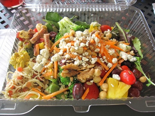 I, of course, got a big salad ๐ Lots of veggies, olives, blue cheese, garbanzo beans, italian salad, some noodles, walnuts and mozzarella salad. It left me QUITE full!