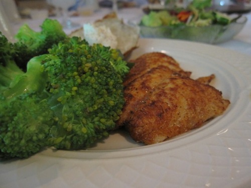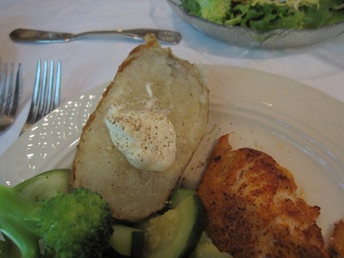 And I had a piece of snapper with half a baked potato with some sour cream and pepper. And broccoli with some zucchini underneath –