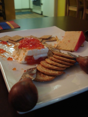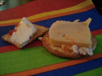 Before heading out last night, Larbs and Matt hosted a wine + cheese cocktail hour at their apartment. I had two 2 oz glasses of a delicious white and two of each kind of cracker –