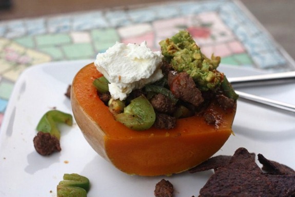 Leftover grass-fed beef (perhaps the best tasting beef I’ve ever had!?) seasoned taco-style with cumin, chili powder, garlic, salt and pepper – PLUS a dash of CINNAMON to marry the taco with the b-nut squash that rocked my world!!
