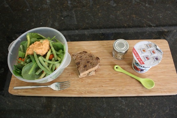 I love that your lunches are always fresh, simple and offer a variety of flavors. And hummus as a salad topping is a great way to give the veggies more staying power- good idea!