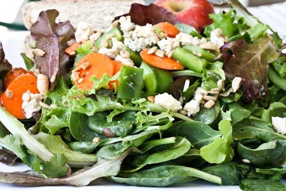And a honkin’ salad – local organic greens, baby spinach, carrot, pepper, Bleu D’Auvergne, sunflower seeds, olive oil, honey, lavender salt.