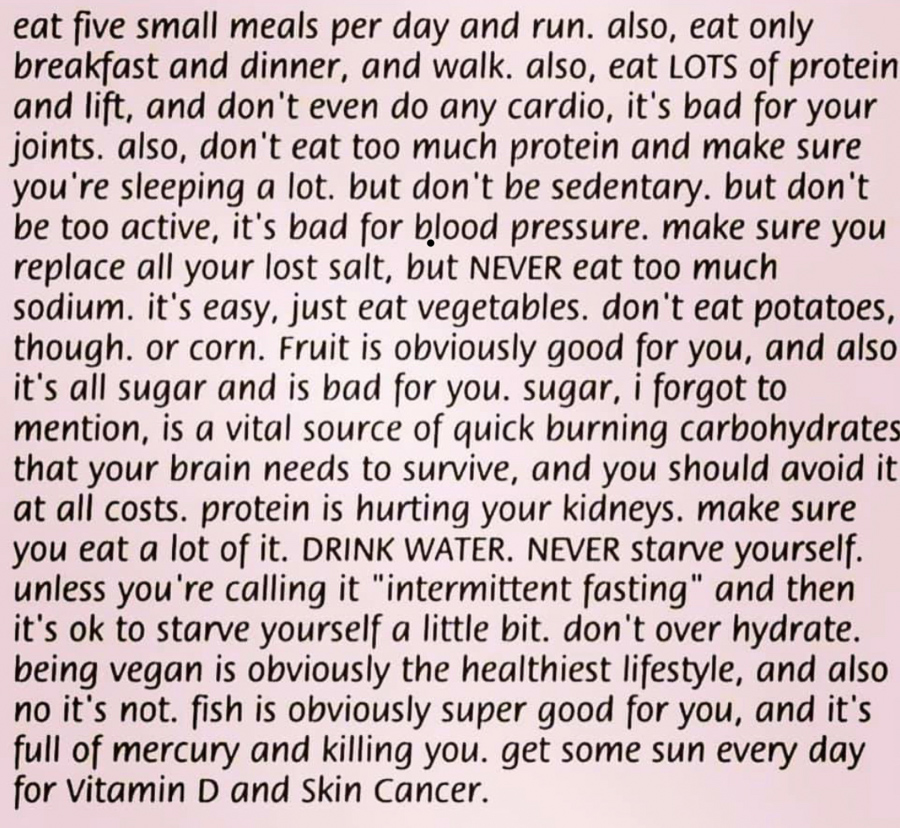 That graphic is exactly how I feel. There is so much confusing information that constantly contradicts other things I’ve read/heard. I have thrown my hands in the air and “given up” more times than I can count. And then I start over with the next thing to see if that is going to be the key for me. But it never is. I lose 10lbs and stall out (and I have way more than 10lbs to lose). I am more than willing to put in the work but I need to see results. I’m not giving up but some days it is so hard. I would love to have a nutrition coach who could help me figure out what is wrong (I highly suspect my issue is hormonal but I haven’t been able to find a doctor who will help me fix it and the internet is full of things like the above graphic). The last dietician I talked to told me that my eating was fine and she didn’t know what was wrong but maybe try getting more sleep. While I understand sleep is important (I did increase my nightly sleep times and it didn’t help) I was hoping for a little more help than that.