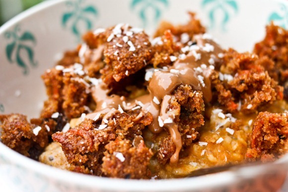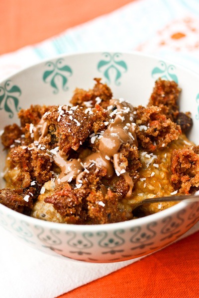 Today’s bowl was Coach’s oats with pumpkin stirred in at end, plus half a banana, chia seeds, a pinch of salt, 1/2 cup each of water and milk – plus Carrot Raisin Walnut muffin crumbles on top and Wild Squirrel butter.