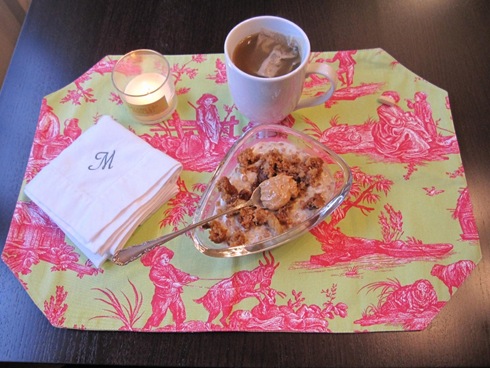 I woke up this morning with the thought of going straight to the gym. Since I have an early lunch date, I felt like I could be more productive if I worked out first, studied second. It’s funny that I used to be the Queen Of 5am Exercise and now I’ve migrated to going mid-morning instead. At the gym today I did an easy 45 minutes on the ET, followed by 5 of upper body lifting. I felt lazy with the lifting and cut it short. Blah. I reasoned that I was going to go home and do 20 minutes of yoga, but that didn’t happen Oatmeal was too enticing! I got my oatpetite back!