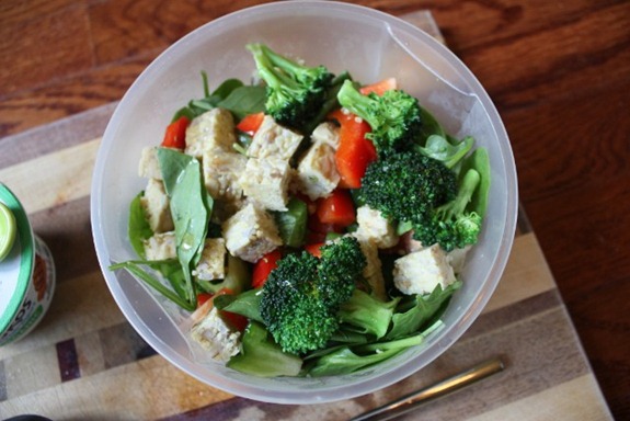 I mixed up a salad with spinach, broccoli (lightly steamed in the microwave – raw broccoli tastes like an ash tray!), bell pepper and tempeh. All drizzled in Garlic Gold Oil and sea salt.