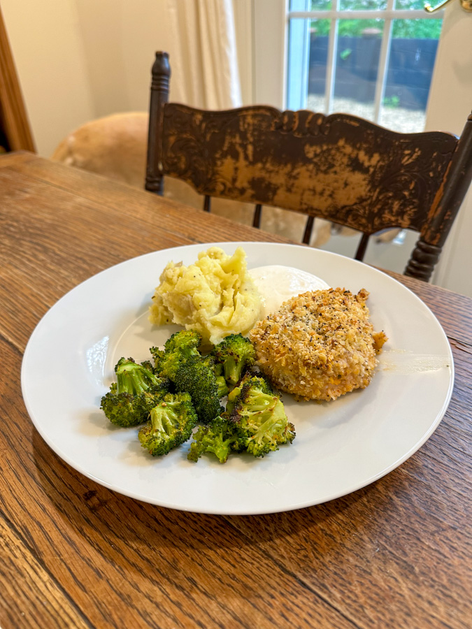 Blue Apron Everything Bagel Crusted Chicken with Mashed Potatoes and Roasted Broc