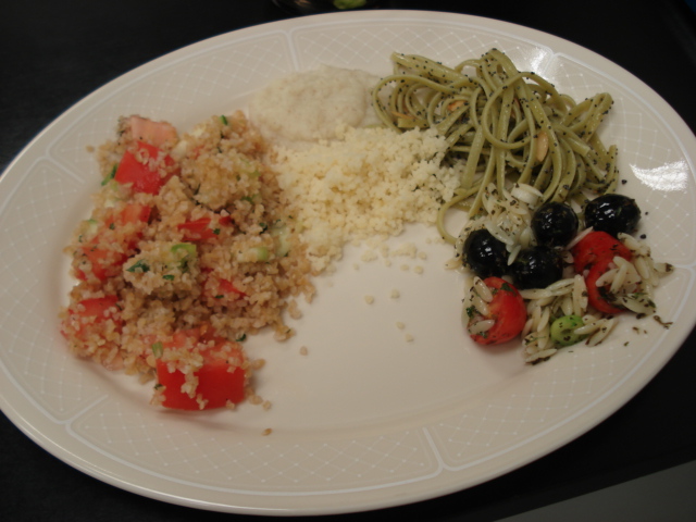 Tabouleh, Cream of Wheat and Couscous, Spinach noodles and Orzo salad. I didn’t try the onion rice or barley soup.