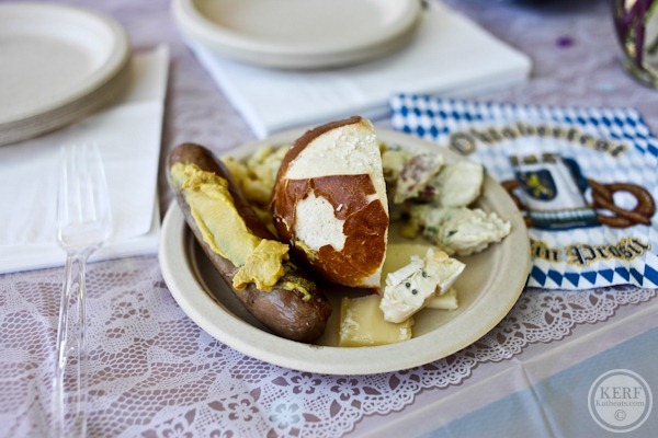 For lunch at had bratwurst, pretzel roll, cheese, potato salad and spätzle