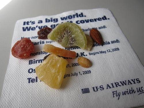 We brought out a few mid-flight snacks: dried fruit, almonds and a bite of banana.