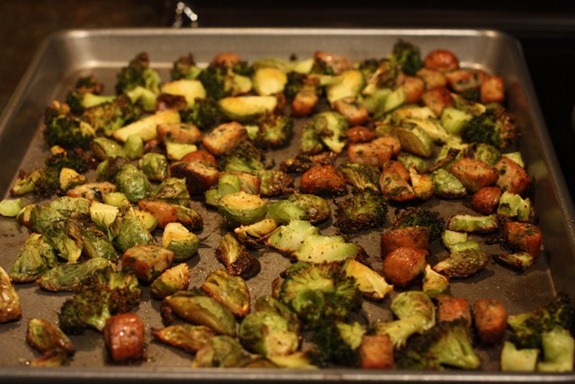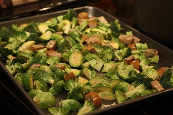 2 Applegate Farms Spinach + Feta Organic Chicken and Turkey Sausages (from the pack I was sent for review) plus a crown of broccoli, and 1.5 cups or so of quartered brussels sprouts tossed in olive oil, salt, pepper and oregano.