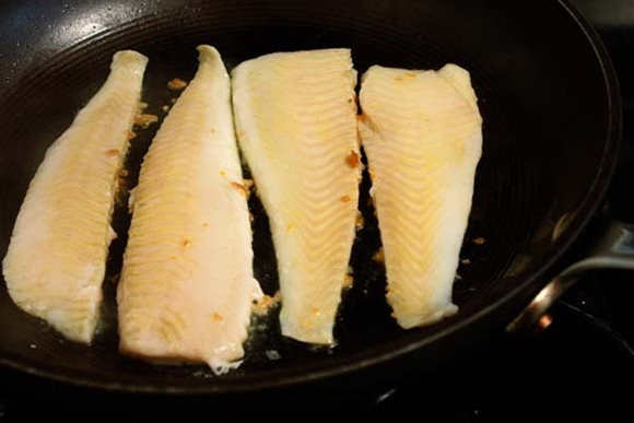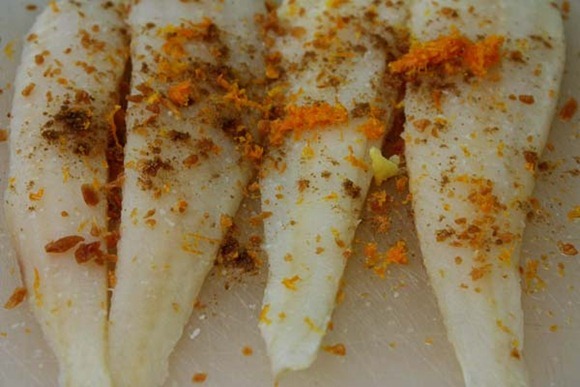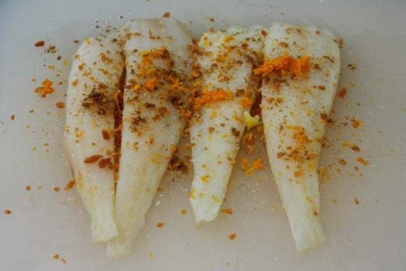 We seasoned the fish with salt, coriander, garlic gold nuggets and orange zest and seared them in a pan.
