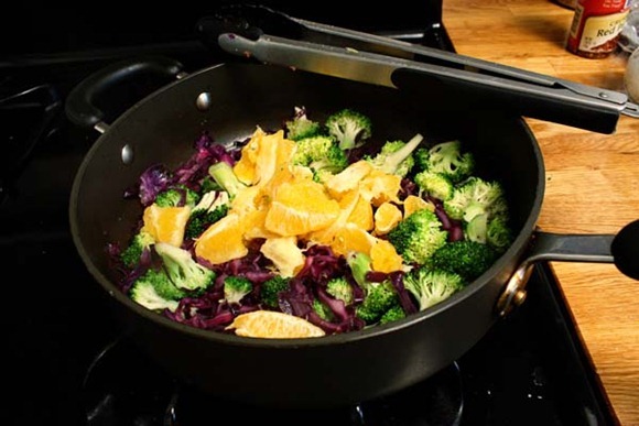 We sauteed half a head of cabbage, chopped, with 1 crown of broccoli and the orange segments in some olive oil and then added pinches of the seasonings to finish.