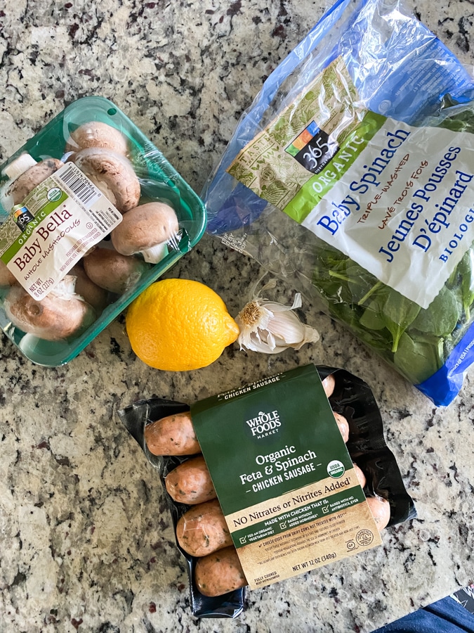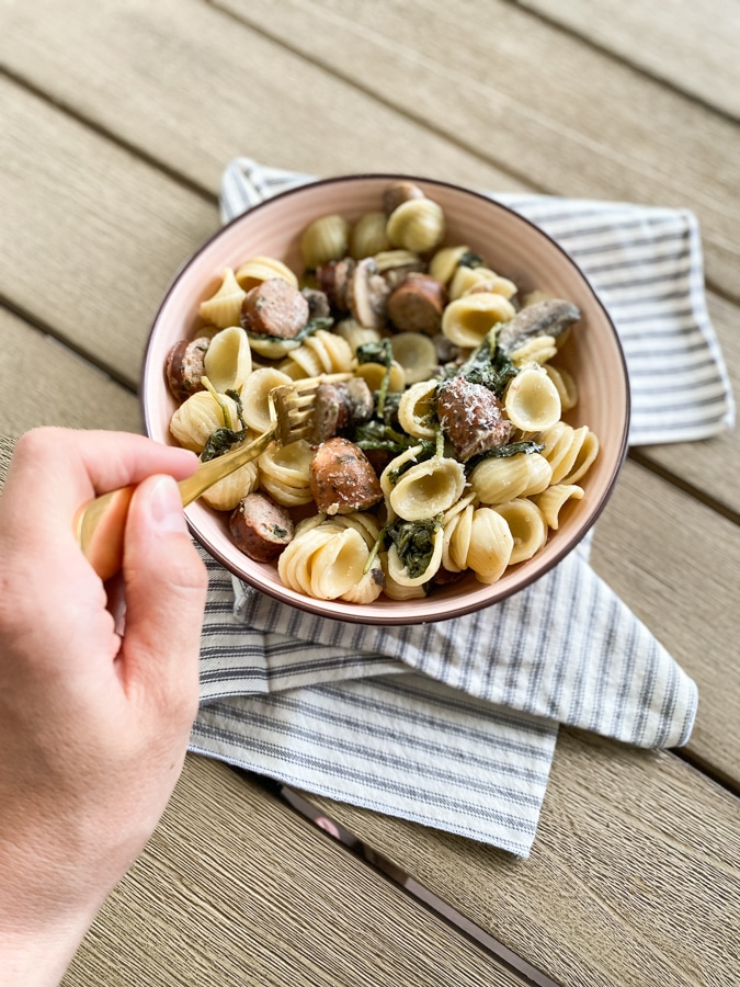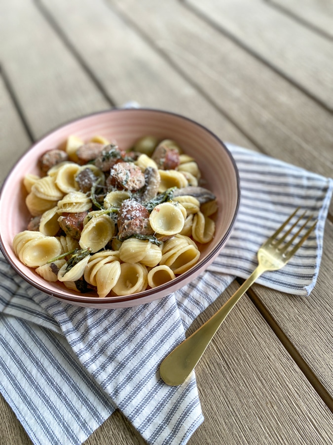 We have been on both a pasta kick and a chicken sausage kick in our house. Both are so easy to incorporate into quick and easy meals that get to the table fast. For this dish, I combined orecchiette pasta (my latest favorite pasta shape) with sausage and mushrooms, wilted spinach, and a simple creamy wine sauce that smells amazing while it’s simmering away. There isn’t a ton of sauce, so the pasta still feels on the light side. If you don’t want to use wine, just sub in chicken broth instead.