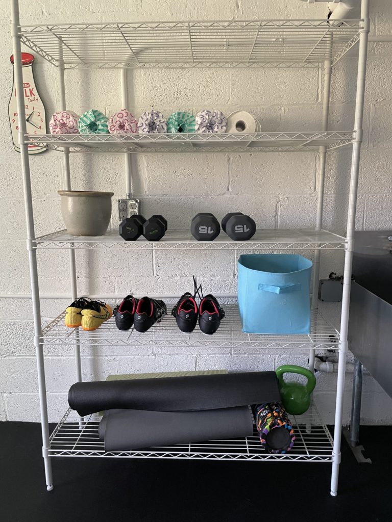 On the left we have our weights and mats, some cleaning supplies to wipe down the bike, face towels for sports, and extra paper towels for the kitchen.