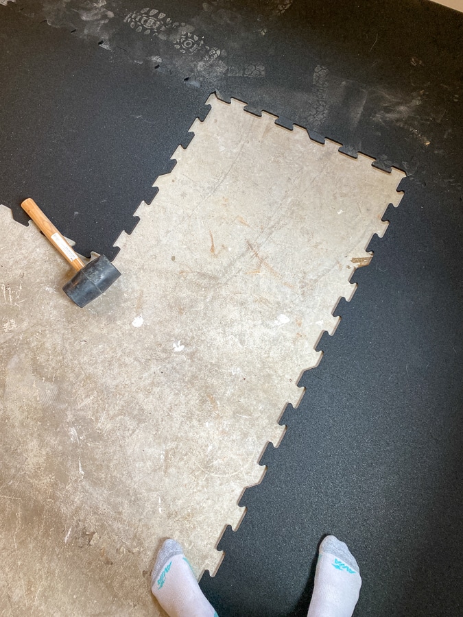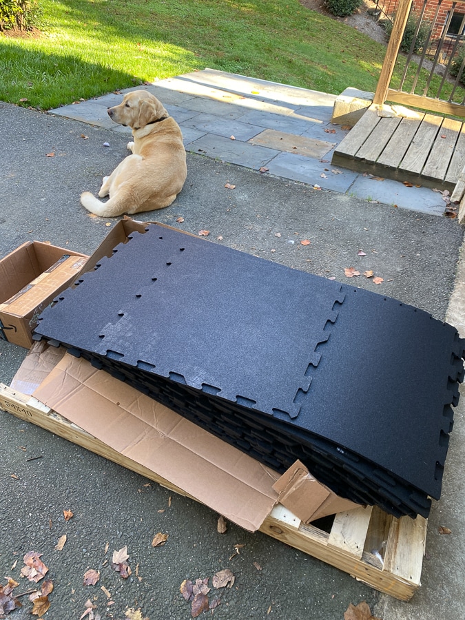 Thomas researched quite a few options and decided on these BounceBack Rubber Tiles from American Floor Mats in Black. The tiles themselves were about $600 and shipping was $250!!!!! But that’s because they were delivered freight on a palate. Thomas assured me that the tiles themselves were less expensive than others and that made up for the lack of free shipping.