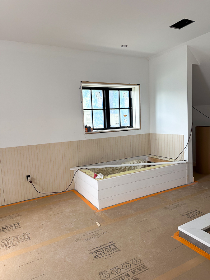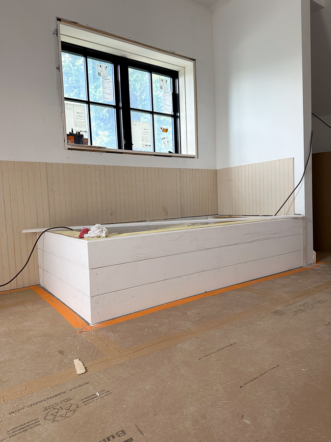 The tub got some plank siding and will have quartz on top to match the shower base and countertops. We are using our old tub!