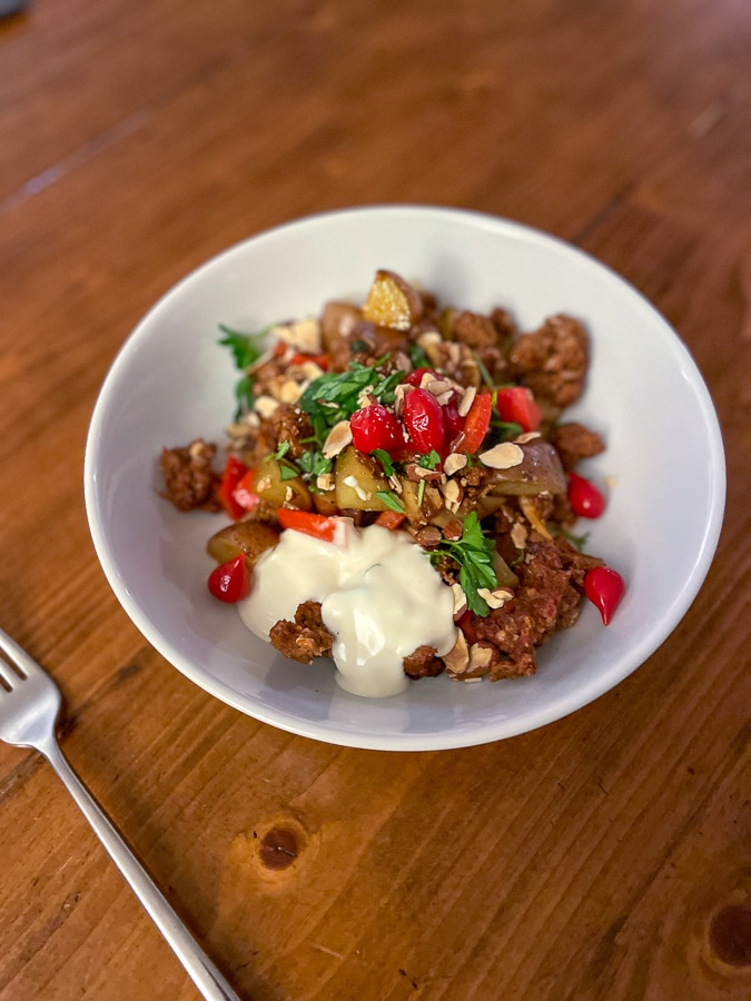 This Chorizo with Potatoes dinner from Blue Apron was really unique! A casserole bake of chorizo with potatoes, peppers, almonds, herbs, and figs!