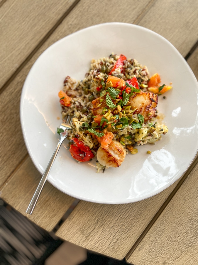 Seared Scallops with rice, citrus salsa, pistachios, and mint! Loved this combo as well.