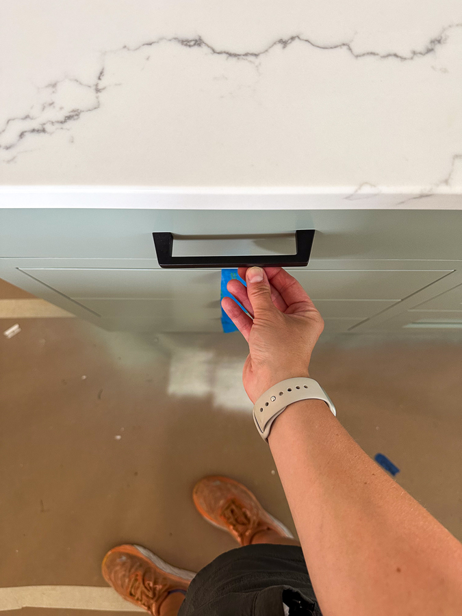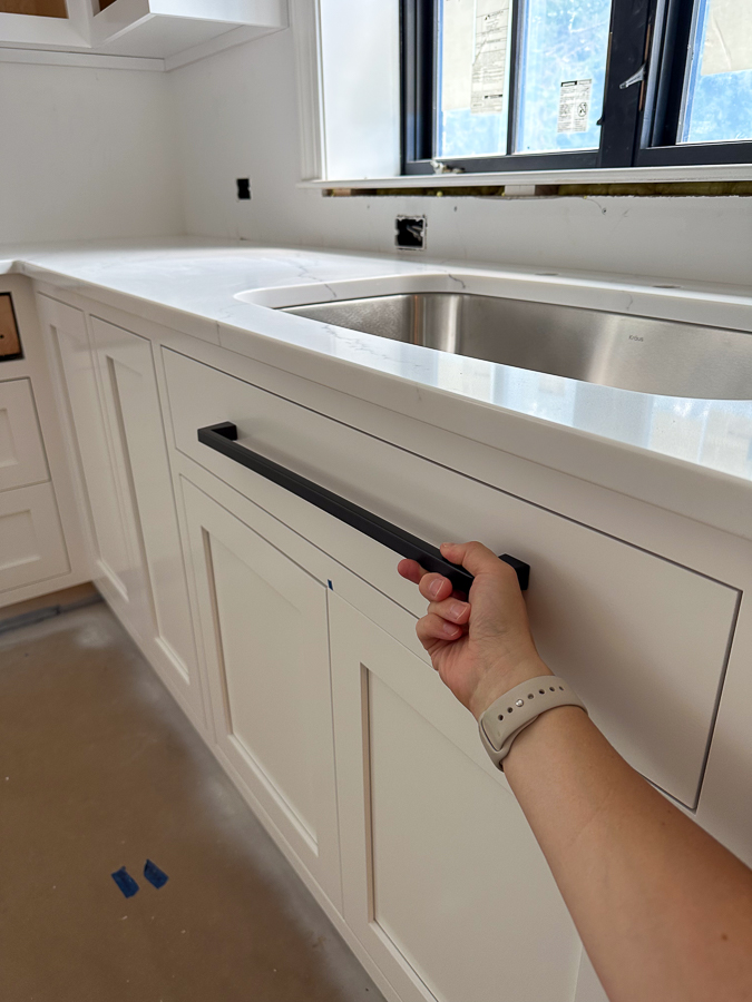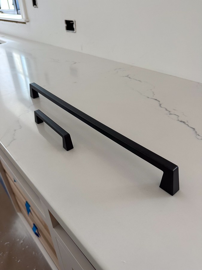 The hardware isn’t on the drawers yet, but we chose Amerock Blackrock (although slight chance this changes due to the cost of the 8″ pulls!) Knobs to match for the cabinets.