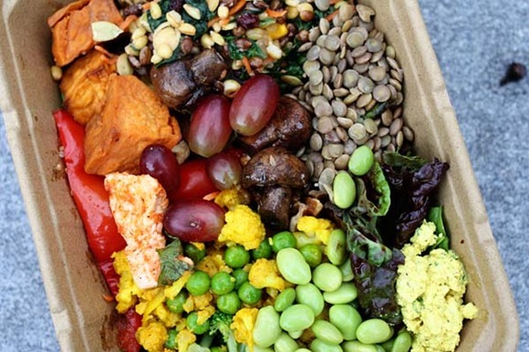 The works – filled with greens, veggies, beans, lentils, sweet potatoes, grapes, mushrooms.