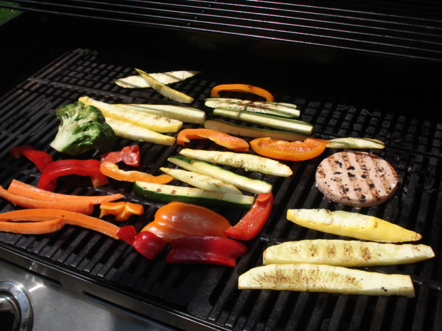 Lunch was quite over the top today! After spending the morning walking, running, cleaning the kitchen floor, and weeding the garden, I got the bright idea to grill my lunch. I never grill. I’m kind of scared of it. The husband is usually the grill master. But here by myself with a craving for grilled vegetables, I took a stab.