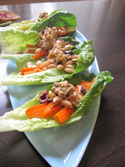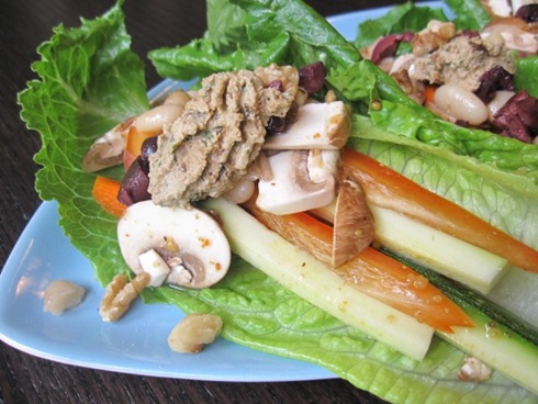 I decided on lettuce wraps because we have a ton of romaine in the fridge. I mixed together a combo of bell pepper, carrot, mushroom, and zucchini strips tossed in the last of my homemade dressing plus a few beans, leftover Gena’s Pizza Cheese, kalamata olives, and walnuts.
